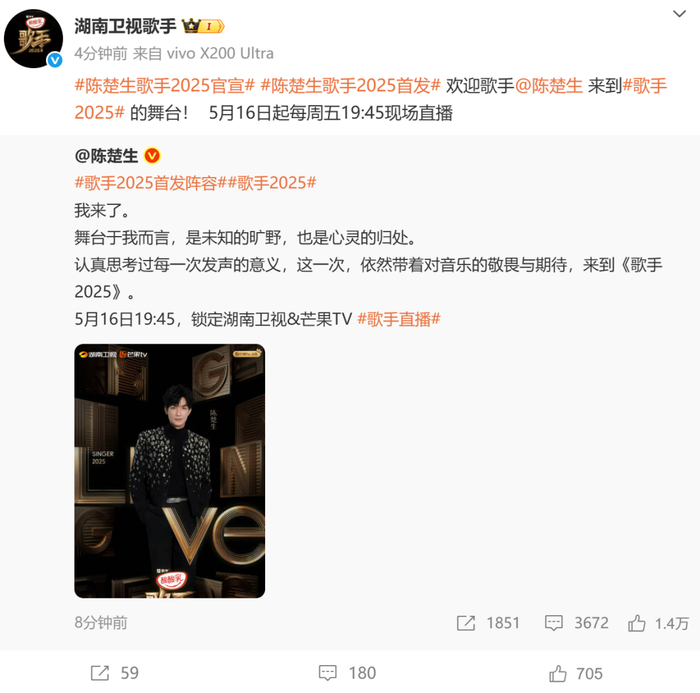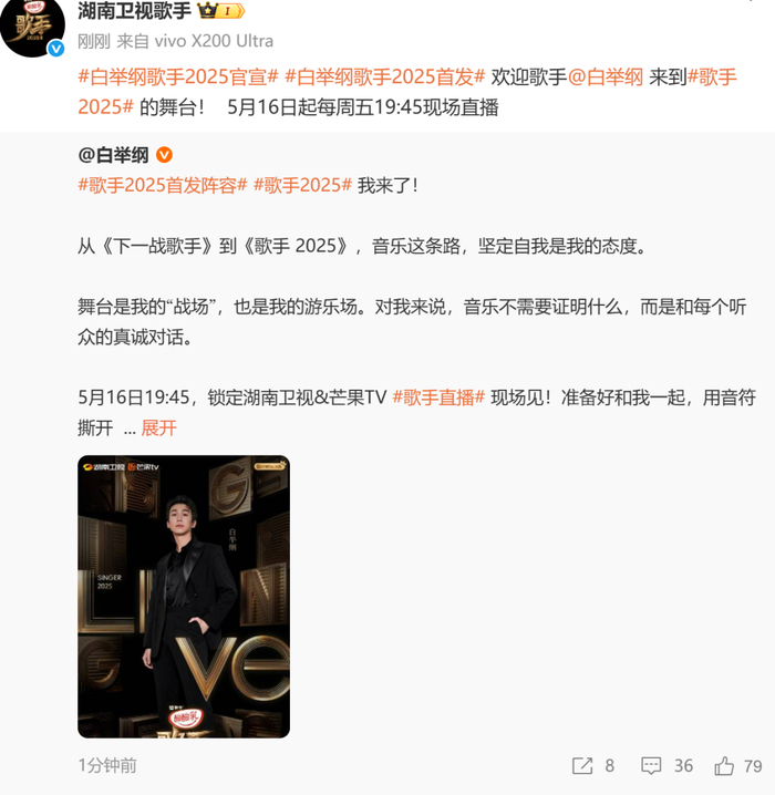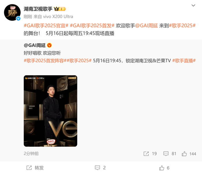 值得一提的是,本季首发歌手中,林志炫、GAI都曾参加过歌手。林志炫在《我是歌手第一季》节目中的精彩舞台,至今仍被不少歌迷奉为经典。《歌手2017》中,林志炫又以逆战歌手身份亮相。此次以首发歌手身份亮相《歌手2025》,他也表示:“每一次发声都是与世界的对话。”