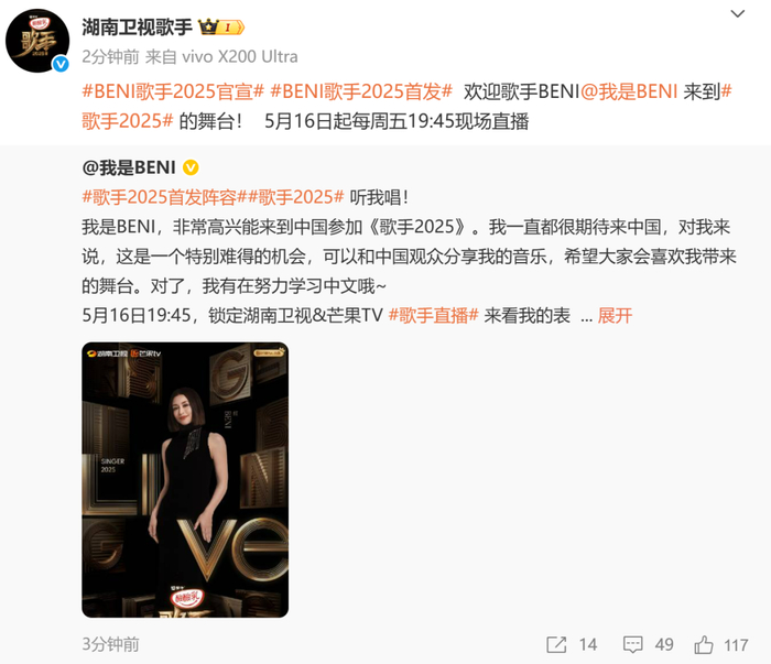 日本流行女歌手BENI,拥有代表作《永远》《kiss kiss kiss》。此次参与歌手,她坦言:“对我来说,这是一个特别难得的机会,可以和中国观众分享我的音乐,希望大家会喜欢我带来的舞台。对了,我有在努力学习中文哦。”