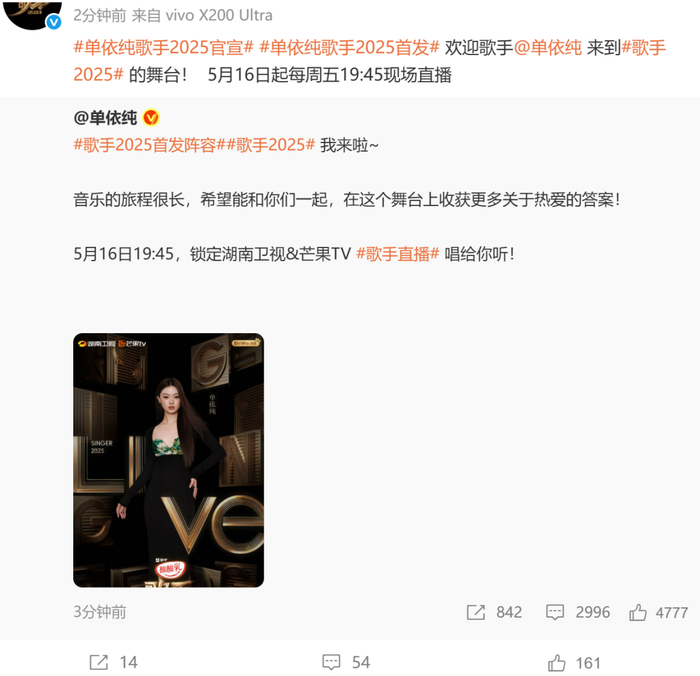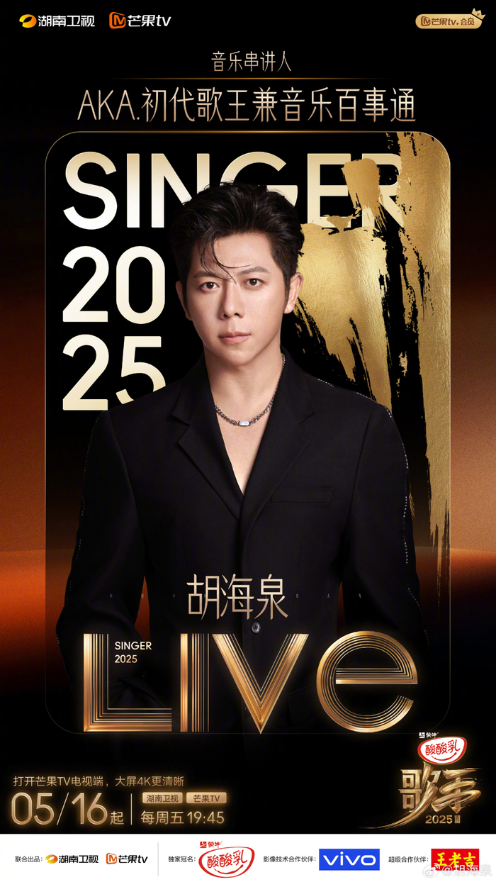 5月12日,@湖南卫视歌手 官宣何炅担任《歌手2025》主持人,沈梦辰担任互动主持人,胡海泉担任音乐串讲人。