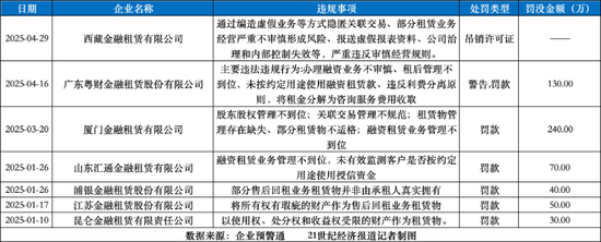2025年监管部门针对金融租赁机构的监管力度持续增强。继3月厦门金租因多项违法违规行为被处以240万元罚款后,4月广东粤财金融租赁股份有限公司再领130万元罚单,相关责任人同时被警告。