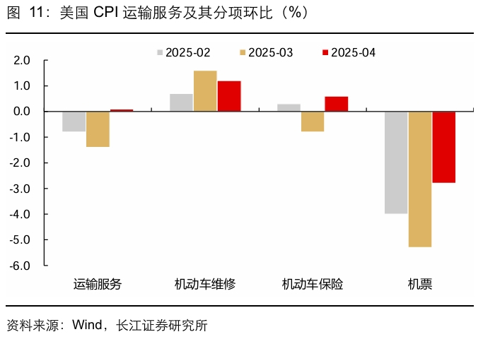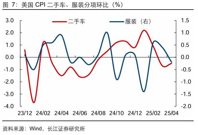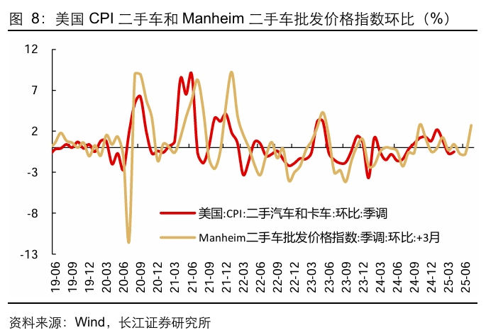 综合来看,核心商品通胀中新车、服装价格均回落,虽然二手车CPI的领先指标 Manheim二手车批发价格指数指向未来二手车CPI环比增速大概率将回升,但整体来看核心商品通胀压力可控。