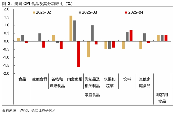 4月美国食品CPI环比增速回落至-0.1%,主要缘于肉禽鱼蛋价格下降带动家庭食品CPI环比增速回落,而非家庭食品CPI环比则继续持平于前值,两者合计对4月整体CPI环比贡献-0.01pct。