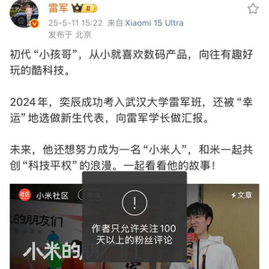 雷军微博开启评论限制,只允许关注100天以上粉丝评论