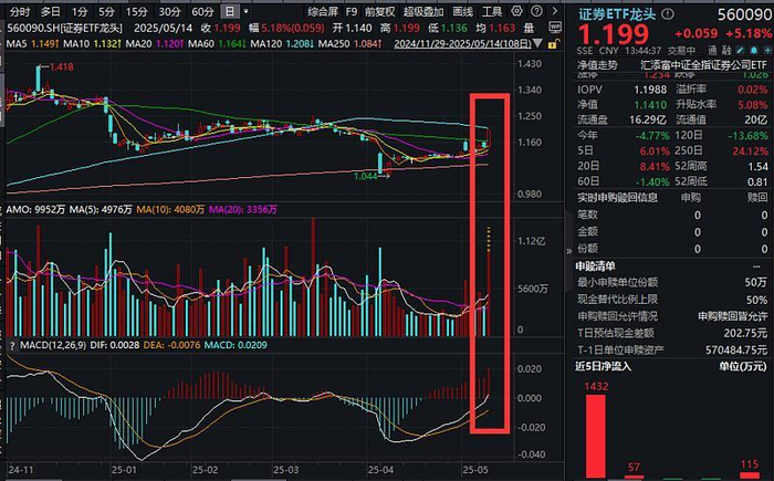 “牛市旗手”$证券ETF龙头(560090)放量涨超5%,成交额快速突破1亿元,已赶超昨日全天成交额!
