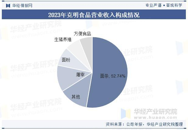 克明食品是国内挂面行业特别是中高端挂面领域龙头企业,长期以来一直专注于米面制品的研发、生产和销售,产品涉及面条、面粉、方便食品等领域,目前已在河南、湖北、湖南等多地建有大规模标准化生产加工基地,产能、销售额、市占率均名列挂面行业前茅,规模持续扩大。营收方面,2023年公司实现总营业收入51.84亿元,同比下滑14.43%。分产品来看,面条是公司第一大收入来源,2023年占总营收比重的52.74%,面粉业务收入为4.53亿元,占比8.73%。