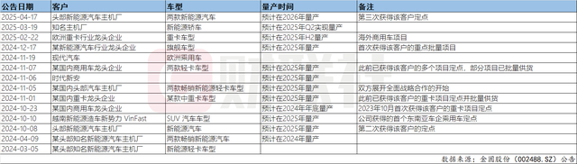 财联社记者梳理过往公告发现,今年1-4月,金固股份新增项目定点3个;而2023年至2024年,公司收获项目定点数量分别为11个、12个。截至目前,金固股份有9个项目定点将于今年进行量产,涵盖重卡、轻卡、现代汽车(欧洲)、头部新能源车主机厂等。
