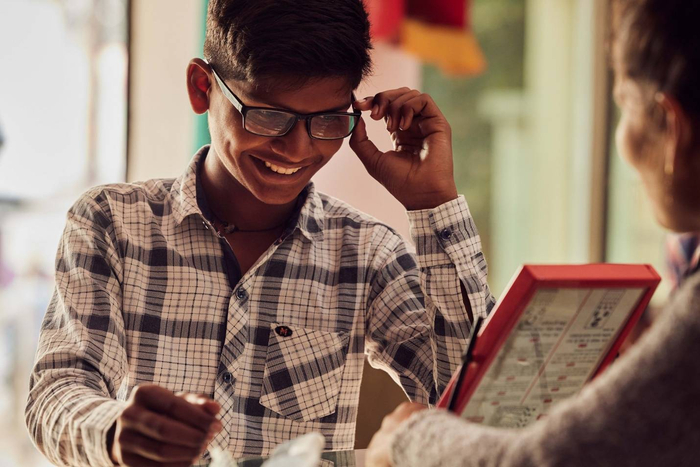 患者普雷姆.库马尔(Prem Kumar)在位于鲍亚恩(Powayan)的视力中心试戴眼镜。借助Peek技术进行眼科检查后,库马尔收到了人生中的第一副眼镜,得以重返校园,并重新开始玩他最爱的板球运动(cricket)。