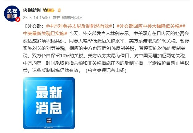 据央视新闻消息,今天,外交部发言人林剑表示,中美双方在日内瓦的经贸会谈达成多项积极共识,同意大幅降低双边关税水平。美方承诺取消91%关税,暂停实施24%的对等关税,相应的中方也取消91%反制关税,暂停实施24%的反制关税,双方各自保留10%的关税。美方以芬太尼为借口,对中国无理加征两轮关税,中方均第一时间采取包括关税和非关税措施在内的反制举措,坚定维护自身正当权益,这些反制措施仍然有效。(总台央视记者申杨)