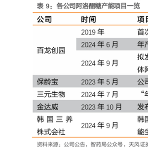 这种情况下,阿洛酮糖的产能将在短时间内大幅提升。国联证券在2024年6月的研报中表示,“在需求高速增长下,国内百龙创园、保龄宝、三元生物、中粮科技、金禾实业、华康生物等企业积极布局阿洛酮糖项目,产能扩张激进,潜在产能达到12.8万吨/年,而当前产能仅为1.5万吨/年,潜在增幅逾8倍,区域性的供给过剩只是时间问题。”