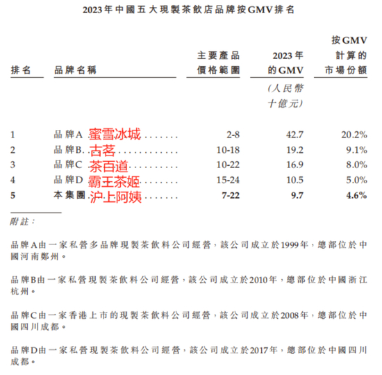 2022-23年,以门店总数及GMV增长率计算,沪上阿姨是国内以门店总数计算的前五大现制茶饮店品牌中增长最快的现制茶饮店品牌。2023年,以GMV计,沪上阿姨市占率为4.6%。