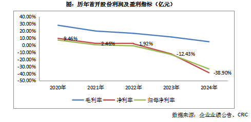 2024年,首开股份实现营业收入242亿元,同比下降49%;毛利润11.6亿元,同比下降79%。毛利率为4.8%,较同期下降了6.7百分点。2024年净利润为亏损94亿元,值得注意的是2023年净利润同样亏损了59亿。