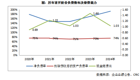2024年末,首开股份持有现金188亿元,较期初下降18%。期末,融资总额为1098亿元,较期初略有下降4%。首开股份于年报中披露,期末剔除预收账款后的资产负债率为74.40%,净负债率为192.4%,现金短债比为1.03倍。