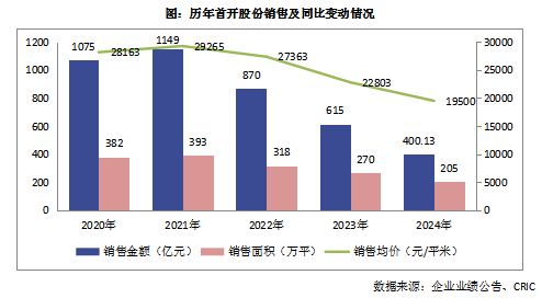 2024年,首开股份实现全口径销售金额400.13亿元,同比降低35%;全口径销售面积205万平方米,同比降低24%;销售均价下降至19500元/平方米。