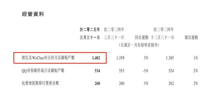 腾讯披露一季报信息,微信及WeChat的合并月活跃账户数14.02亿,同比增长3%,相比于2024年末的13.85亿进一步环比增长1%,这也是微信月活用户首次突破14亿。此外,QQ的移动终端月活跃账户数5.34亿,同比下降3%,环比增长2%。