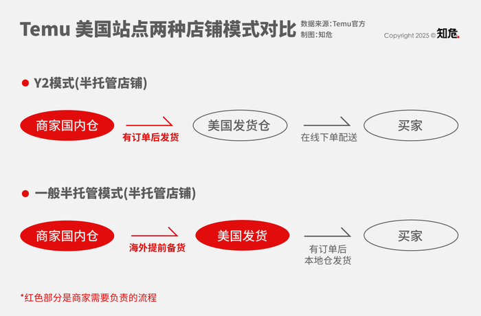 Temu 商家阿门告诉知危:“ Y2 的本质还是半托模式的延展,在平台依然掌握着核价权和前端定价权的情况下,商家需要做的事情比全托管模式要多很多,且要承担更高的成本( 头程尾程以及关税等等 )。” 和一般半托管的最大区别在于,Y2 不需要提前备货至海外仓,是有订单后从国内发货,平台给了较长的发货时效( 9 个工作日内发货 )。