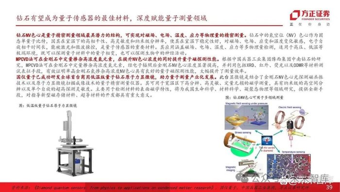 钻石NV色心是量子精密测量领域最具潜力的结构,可实现对磁场、电场、温度、应力等物理量的精密测量。钻石中的氮空位(NV)色心作为固 态单量子比特,因其在室温下的高相干性、高灵敏度和纳米级分辨率,使其在室温下稳定性好,对磁场、电场、应变和温度变化敏感,电子自 旋相干时间长,能被激光和微波操控,是量子传感器的重要材料。其应用涵盖磁场、电场、温度、应力等多物理量检测,适用于高压、低温等 极端环境,既可以探测量子材料中的量子相变,也可以探测生物中的神经活动。 MPCVD法可在金刚石中定量掺杂高浓度氮元素,在提升NV色心浓度的同时提升量子磁探测性能。根据中国兵器工业集团豫西集团中南钻石的研 究,MPCVD法可在金刚石中定量掺杂高浓度氮元素,经电子辐照后金刚石NV色心浓度显著提高,并利用包括XRD、红外、荧光以及ODMR等材料测 试表征手段,有效证明单晶金刚石氮掺杂高浓度NV色心具有良好的量子磁探测性能,大幅提升了测量效率。 国仪量子已成功研发全球首台商用低温版量子钻石原子力显微镜,助力量子测量产业化发展。此台显微镜是结合了金刚石NV色心光探测磁共振 技术以及原子力显微镜扫描成像技术的量子精密测量仪器。其可用于宽温区下高分辨、高灵敏、定量无损的磁学测量,具有纳米级的高空间分 辨以及单个自旋的超高探测灵敏度。主要用于检测材料的表面磁学特性,将为我国生命科学、材料科学、凝聚态物理等领域研究,提供全新手 段,对指导新型磁存储材料、超导材料的开发都具有重大意义。
