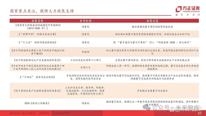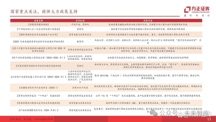 国内:目前,中央、东部沿海省市及部分中部16个省份均发布一系列相关政策,支持量子信息科技发展。2024年两会期间,国务院国资委指出,2025年中央企 业战略性新兴产业收入的占比要达35%,在类脑智能、量子信息、可控核聚变等方面要提前布局,到2030年要实现百万级量子计算机。2月20日,国内发布全 球首例基于集成光量子芯片的“连续变量”量子纠缠簇态,使量子计算距离实用化再近一步。国内研发的105个量子比特的“祖冲之三号”量子计算机正式发 表,为目前超导量子计算的最强优越性。我国第三代自主超导量子计算机“本源悟空”突破2000万次全球访问量。