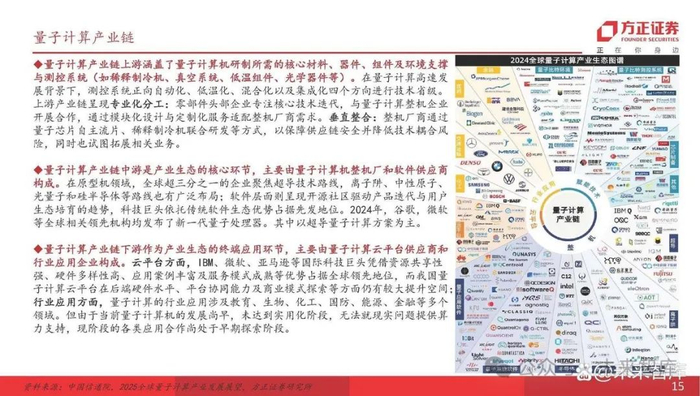 量子计算产业链上游涵盖了量子计算机研制所需的核心材料、器件、组件及环境支撑 与测控系统(如稀释制冷机、真空系统、低温组件、光学器件等)。在量子计算高速发 展背景下,测控系统正向自动化、低温化、混合化以及集成化四个方向进行技术省级。 上游产业链呈现专业化分工:零部件头部企业专注核心技术迭代,与量子计算整机企业 开展合作,通过模块化设计与定制化服务适配整机厂商需求。垂直整合:整机厂商通过 量子芯片自主流片、稀释制冷机联合研发等方式,以保障供应链安全并降低技术耦合风 险,同时也试图拓展相关业务。