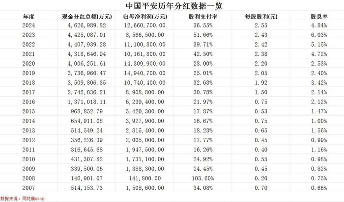 2021-2023年寿险改革深水期,A股地产行业表现也不太好,保险业投资端增长失速,几乎全部寿险集团分派金额都在下降。但彼时中国平安分红与营运利润挂钩,即使净利润下滑,中国平安也依旧增加了派息金额。