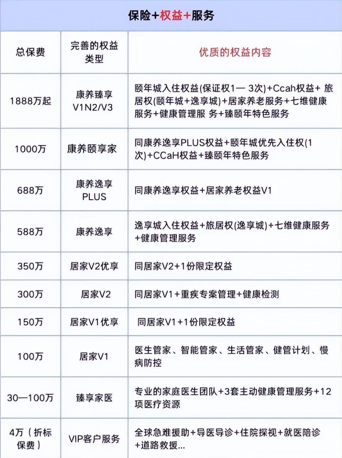 目前从低到高,中国平安已拥有臻享家医、四档居家权益、四档康养权益(搭配逸享城、颐年城+Ccah+旅居不同组合)。