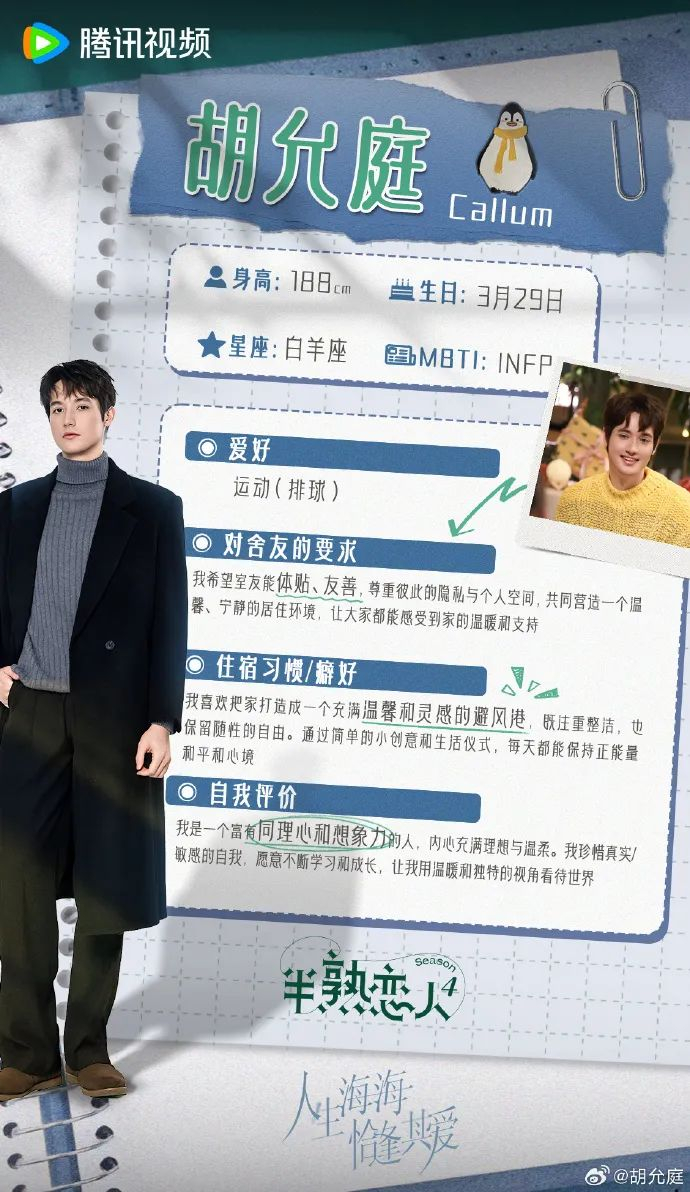 胡允庭作为素人参加《半熟恋人4》,他自述是年龄最小的成员,同时也是刚从一份稳定的HR工作转行到陌生的模特行业。
