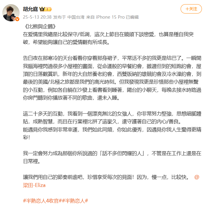 5月13日晚,《半熟恋人4》迎来收官,梁田、胡允庭双双发长文官宣恋情。