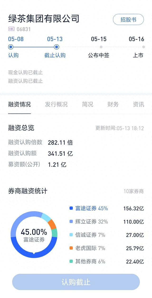 绿茶集团IPO日前停止认购,融资认购倍数达到282.11倍,融资认购金额为341.51亿港元,富途证券融资认购为156.32亿港元,辉立证券为110亿港元。