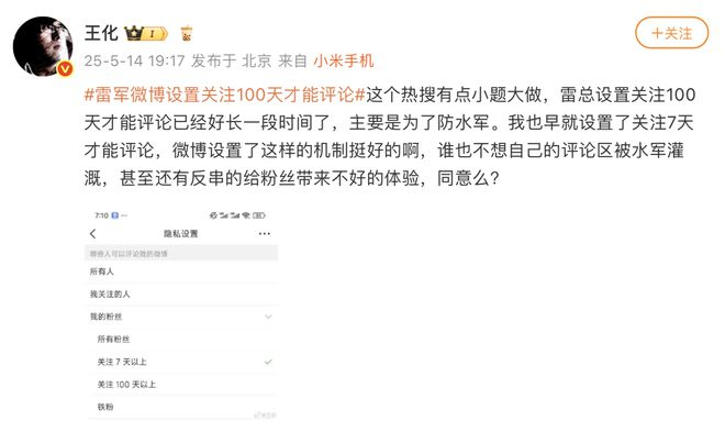 雷军微博设置关注100天才能评论,王化回应:为了防水军,已有一段时间