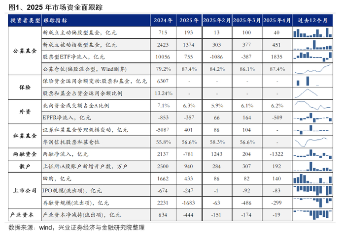 4月初,超预期的特朗普政府关税冲击全球资本市场,A股受拖累出现剧烈动荡,包括汇金增持ETF、上市公司与产业资本进行回购增持,稳市资金协力打破市场恐慌式下跌,指数在大幅调整后随即进入上行修复通道。当前各类资金体量接近,公募25Q1主动权益管理规模2.9万亿元,包括ETF在内的被动指数基金3.2万亿元规模,外资25Q1包括陆股通与QFII规模约3.0万亿元,险资24Q4持有股票2.4万亿元,两融5月9日规模1.8万亿元,私募3月底持股规模估算3.0万亿元,各类资金体量旗鼓相当,并且各类资金聚焦于自身偏好的领域,间接导致短期市场主线不明确、相对混沌。后续关注各类资金的边际增量强弱、以及可能的“破圈”影响市场风格。