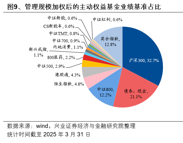 与此同时,新规明确要求公募基金强化业绩比较基准的约束作用,要求为每只基金产品设定清晰的业绩比较基准,尽量确保投资者所见即所得。统计今年1月底以前成立、有一季报的4477只主动权益(普通股票型+偏股混合型+灵活配置型)基金,可以发现主动权益基金业绩基准主要锚定沪深300指数上,共有2574只基金业绩比较基准中用到沪深300指数,占比达57.5%;用沪深300指数作为主要业绩比较基准的基金共计2068只,占比达46.2%。根据一季报管理规模加权每只基金对应的业绩基准,业绩比较基准对应管理规模居前的指数主要为沪深300指数(32.7%)、中证800指数(12.2%)、恒生指数(4.8%)、上证港股通指数(4.3%)、中证500指数(2.9%)。