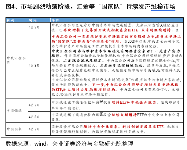 中央汇金公司首次明确类“平准基金”定位,向市场传递了“底线思维”信号。4月7日,汇金公司公告称,“已再次增持了交易型开放式指数基金,未来将继续增持”;4月8日,汇金公司公告答记者问,在维护资本市场稳定中,汇金公司的定位是“国家队”,并发挥着类“平准基金”作用。