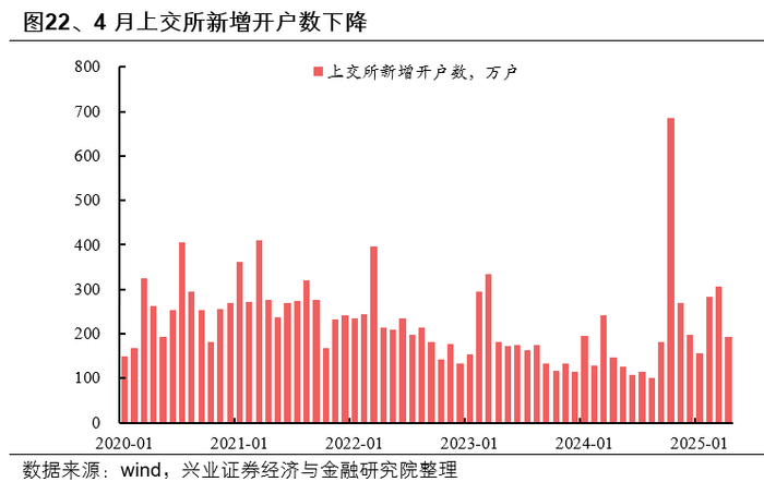 新增开户数下降,个人投资者情绪减弱。4月上交所新增A股账户开户数192万户,较2月份284万户、3月份307万户下降,个人投资者参与资本市场的情绪有所减弱。