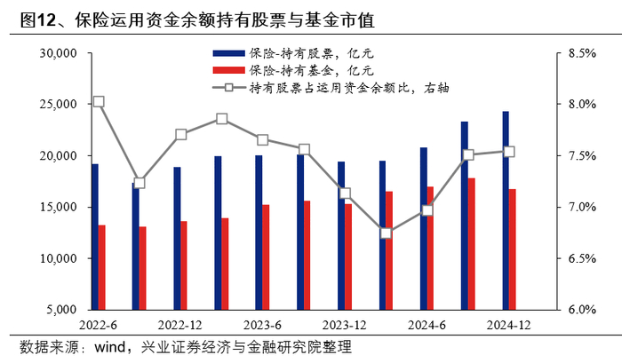 近年来保险资金成为资本市场重要边际增量资金,2024年全年保险持有股票+基金规模增长6307亿元。根据国家金融监管总局数据,截至最新2024年四季度,保险运用资金余额持有股票提升936亿元,持股规模占运用资金余额比例小幅提升0.04pct至7.55%,险资对于权益资产的增配主要由负债端增长驱动。