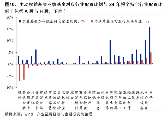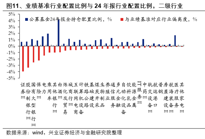 按照基金2024年全持仓角度看,相较于业绩基准,主动权益基金欠配银行、非银金融板块较多,超配电子、电力设备板块。根据基金业绩基准对应的行业配置比例,以及2024基金年报披露的全部持仓行业占比角度看,公募基金在银行、非银金融、公用事业、计算机、食品饮料行业的欠配比例居前,欠配比例分别为-7.3%、-6.6%、-1.5%、-0.8%、-0.7%;在电子、电力设备、机械设备、汽车、通信行业的超配比例居前,超配比例分别为+5.0%、+2.5%、+1.7%、+1.4%、+1.3%。
