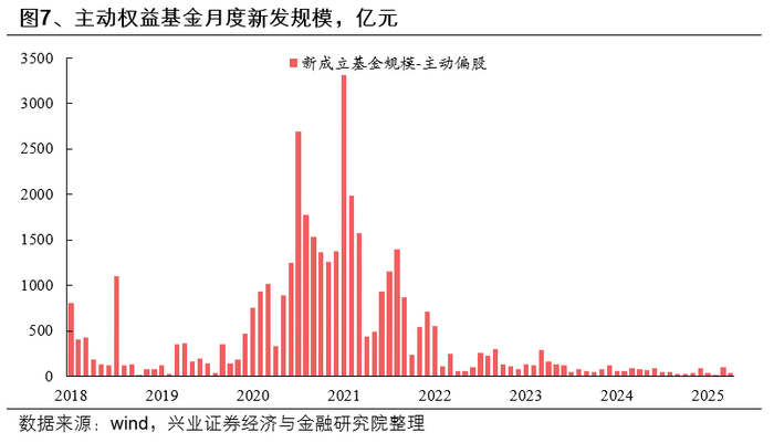 受市场剧烈动荡影响,4月份主动权益基金新发降温,年初以来的主动权益新发改善趋势未能延续。一季度在市场赚钱效应与公募超额收益回归的共同催化下,主动权益基金新发市场迎来回暖,多只非红利的主动权益基金实现10亿元以上的新发规模,已经较2024年有改善迹象。但4月初特朗普关税冲击导致市场剧烈动荡,主动权益基金新发再度转冷,4月主动权益基金(普通股票型+偏股混合型+灵活配置型)新发规模为40亿元,环比3月新发规模减少60亿元。