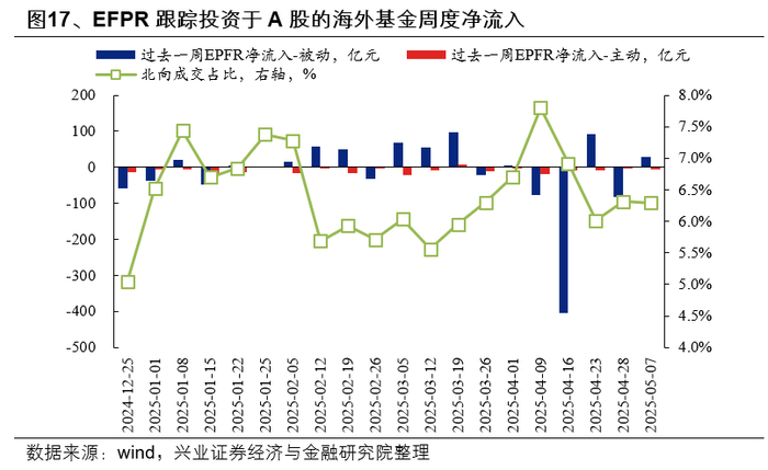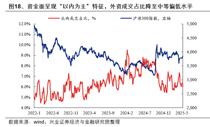 4月外资转为净流出,但随着市场资金活跃度提升,资本市场也呈现出“以内为主”的特征。根据EPFR数据,4月投资于A股的海外基金净流出509亿元,打破2月、3月两个月连续净流入的趋势。但值得注意的是,4月7日、8日市场大幅波动期间,虽然外资成交占比有所提升,但并未明显流出,随着市场进入修复上行阶段的第二周,外资反而加速流出。另一方面,去年9月底市场反转以来,资本市场也呈现出“以内为主”的特征,外资成交额占全A成交额的比例趋势下行,外资流向对于市场的影响也边际减弱,尽管4月初外资成交占比阶段性提升,但从2月中旬以来整体维持6%左右,相比去年9月底以前占比8%下降明显。