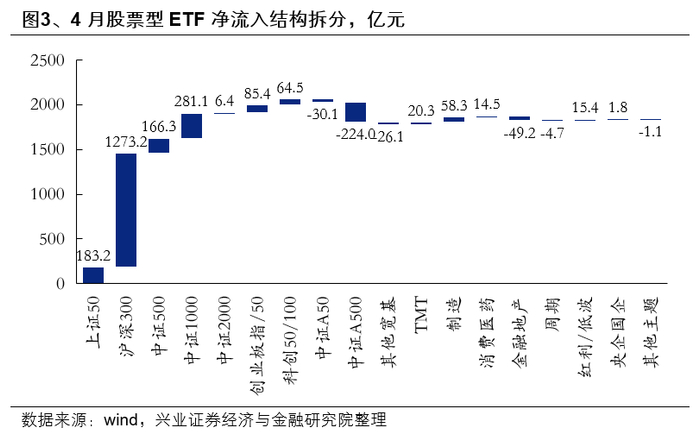 从流入结构上看,沪深300、中证1000ETF是4月主要增量。4月以来,宽基指数ETF净流入,其中沪深300ETF(+1273亿元)与中证1000ETF(+281亿元)净流入居前,而行业主题ETF净流入趋势有所放缓。