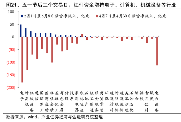 3月中旬两融规模突破21年5月的高点,一度逼近2万亿元的大关,但受海外风险扰动,4月两融资金净流出,但从4月下旬两融规模已经开始止跌企稳,五一节后三个交易日,两融转为净流入223亿元,杠杆资金的风险偏好回升。4月两融资金净流出1322亿元,为2020年以来的单月第二大净流出。从行业资金流向上看,4月净流出居前的分别为电子(-153亿元)、计算机(-117亿元)、非银金融(-98亿元)、通信(-83亿元)、电气设备(-79亿元)、机械设备(-70亿元)。但4月下旬两融规模已经止跌企稳,五一节后再度转为净流入,其中电子(49亿元)、计算机(36亿元)、机械设备(23亿元)、通信(17亿元)、国防军工(17亿元)的净流入规模居前。