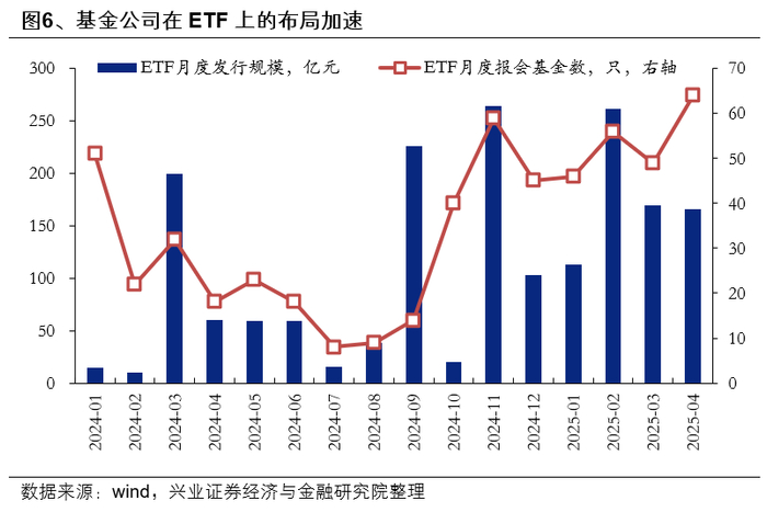 基金公司在ETF上的布局加速,ETF新发与报会均维持较高热度。从去年10月以来,基金公司ETF与相关联接产品的报会速度快速提升,并从去年11月以后,ETF产品的月度新发规模上台阶来到月均至少150亿元左右,成为权益类基金新发的重要支撑。今年4月基金公司报会ETF产品64只,并以科创板综指、科创板/创业板人工智能、自由现金流相关指数产品为主,预计后续ETF新发仍将维持较高热度。