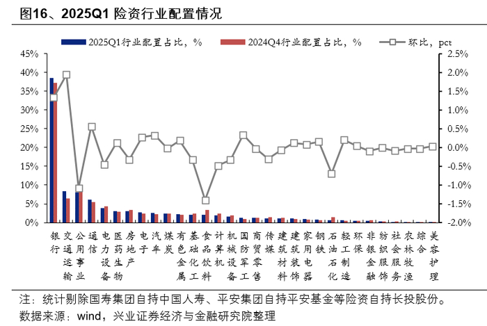 今年一季度,险资持有银行、交通运输仓位提升较多,公用事业、食品饮料仓位下降较为明显。根据上市公司一季报的十大股东数据统计,险资持有银行、交通运输、公用事业、通信、电力设备等行业占比较高,分别为38.6%、8.4%、8.1%、6.1%、3.8%。其中一季度险资持有银行、交通运输仓位提升较多,环比去年年底提升1.3pct与1.9pct,公用事业、食品饮料仓位下降较多,环比分别下降1.1pct、1.4pct。