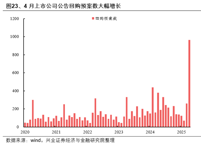 4月初市场剧烈动荡阶段,上市公司密集公告回购预案,稳定投资者预期,彰显管理层对于公司经营以及后续资本市场的信心。4月上市公司公告回购预案964起,占上市公司总数的17.8%,此外,根据公告日统计的回购情况看,4月上市公司回购140亿元,较此前明显提升。