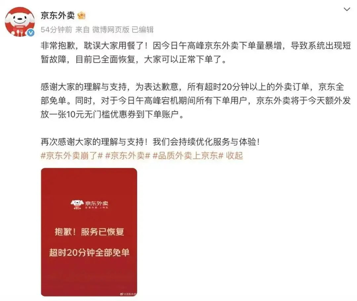对此,今天17时许,京东外卖官方微博账户回应称,今日午间,因京东外卖618活动订单量暴涨,导致系统出现短暂故障,目前已全面恢复。