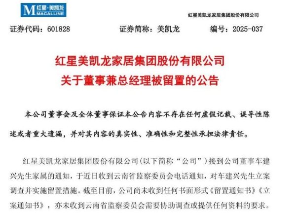 5月13日,红星美凯龙家居集团股份有限公司(601828.SH,以下简称“红星美凯龙”)公告称,公司董事兼总经理车建兴近日收到云南省监察委员会电话通知,对其立案调查并实施留置措施。