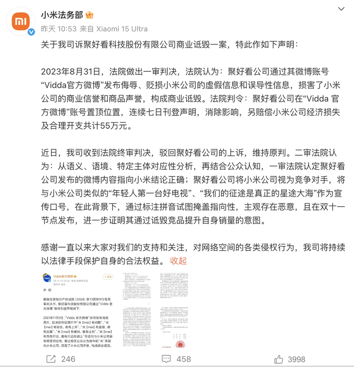 5月13日,@小米法务部就关于诉聚好看科技股份有限公司商业诋毁一案发布声明: