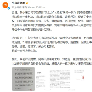 5月14日傍晚,@小米法务部发文:近日,就小米公司与自媒体“民之力”(又名“网络一兵”)网络侵权责任纠纷一案,法院作出一审判决。法院认定被告存在侮辱、诽谤行为,侵害了小米公司的名誉权。判令被告删除在抖音、头条、哔哩哔哩、西瓜视频、快手、微信视频号、微信公众号平台账号内发布的侵权内容,发布声明消除给小米公司造成的负面影响,并赔偿小米公司各项损失共计6万元。