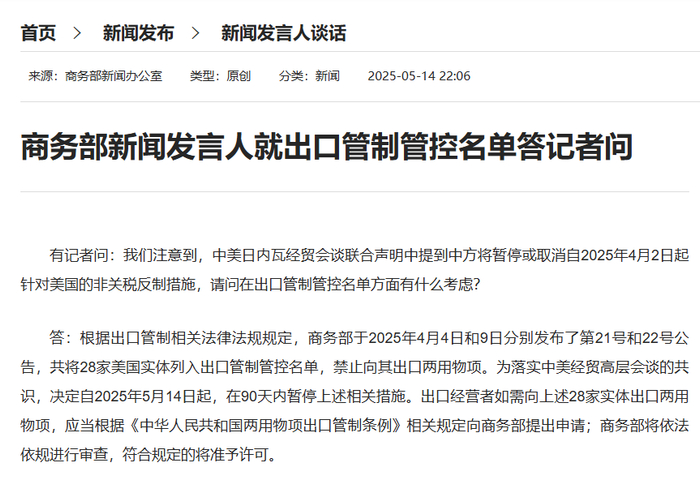 有记者问:我们注意到,中美日内瓦经贸会谈联合声明中提到中方将暂停或取消自2025年4月2日起针对美国的非关税反制措施,请问在出口管制管控名单方面有什么考虑?