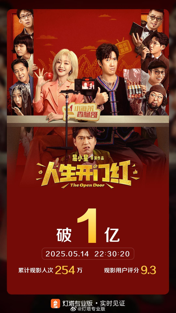 据灯塔专业版实时数据,截至5月14日22时30分,影片《人生开门红》票房突破1亿。