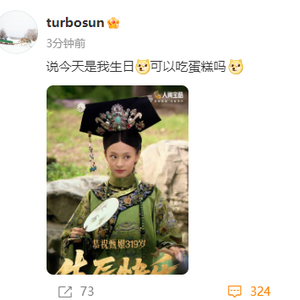 5月14日,演员孙俪晒出“祝甄嬛319岁生辰快乐”的海报,并配文:“说今天是我生日,可以吃蛋糕吗?”