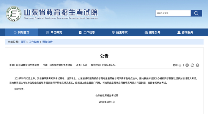 针对“考生姜昭鹏为救同学错过考试”事件,5月14日,山东省教育招生考试院发布公告:5月10日上午,山东省春季高考知识考试开考。当天早上,山东省城市服务技师学院考生姜某在与同学乘车赴考点途中,因抢救并护送突发心梗的同学就医耽误参加首场语文考试。当地教育招生考试单位和山东省城市服务技师学院核实情况属实。经报请上级主管部门同意,将按照规定程序启用春季高考语文科目副题,安排姜某参加考试。