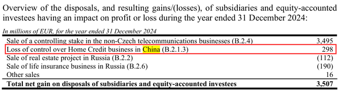 PPF年报提到,2024年12月31日,在获得中国监管机构批准后,京东成为捷信消费金融有限公司的大股东。集团于同日对该实体进行了拆分,并确认了2.98亿欧元的处置收益。收益是减少负债的结果,这是与我们的主要贷款人达成的交易中债务减少和股权变更的结果。根据该交易,集团保留捷信消费金融2%的股权。